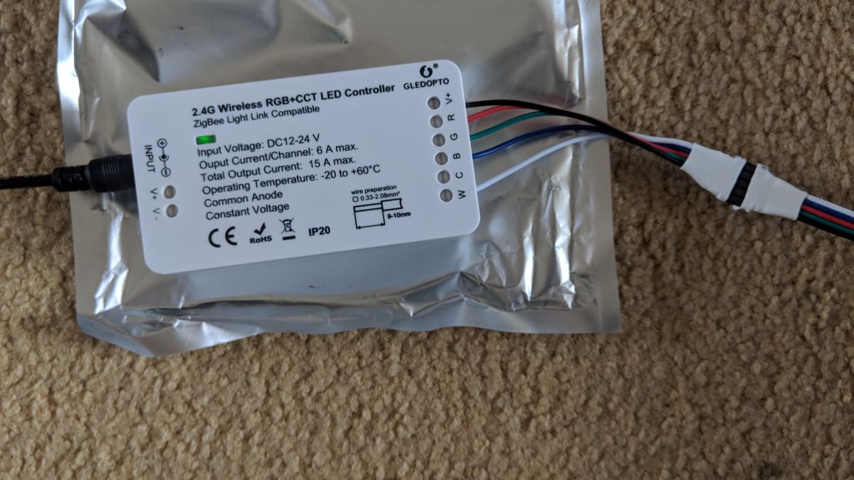Recently, however, I came across a new brand: Gledopto, which is advertising Hue and Tradfi compatible controllers that require zero soldering or software hacking to get it working, which sounded promising. I ordered the basic RGB version (read on for more about the options), which is cheapest, along with a roll of cheap RGB LEDs and waited.